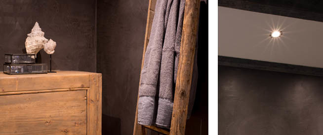De wanden van deze badkamer zijn behandeld met beton ciré. Dit is een gewreven en gewaxt beton. Het wordt handmatig aangebracht met vegende bewegingen. Hierdoor krijg je deze aparte structuur op de muur. Beton ciré is verkrijgbaar in veel verschillende kleuren. Het is niet alleen mooi om te zien, maar ook nog eens heel onderhoudsvriendelijk. Je hebt nooit meer last van vieze voegen, zoals je dat hebt met wandtegels. En doordat beton ciré met hars gebonden is, is het watervast. Dus prima geschikt voor de badkamer!