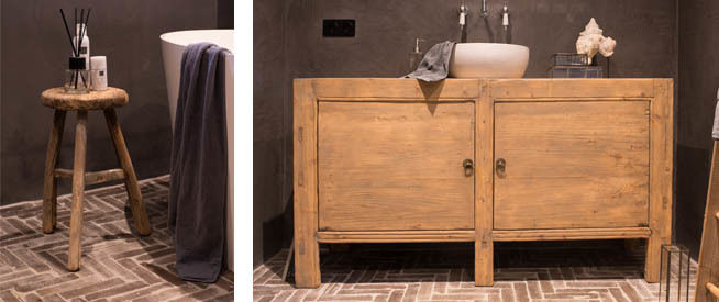 Het oud houten krukje naast het bad is praktisch en tegelijk ook heel stijlvol. Handig om je shampoo en douchegel op te zetten. Zo heb je alles binnen handbereik.