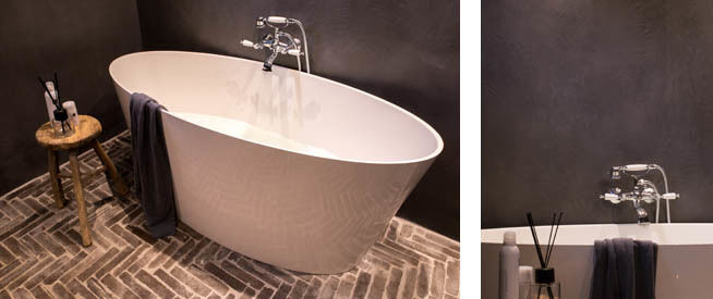 In tegenstelling tot de vloer en wanden, is het ovale witte vrijstaande bad wat moderner. Dit is een prachtige match! De landelijke stijl wordt hierdoor verrassend en vernieuwend.